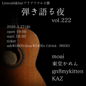 liveaquarium カレンダー カレンダーに追加 Timely カレンダーに追加 Google に追加 Outlook に追加 Apple カレンダーに追加 他のカレンダーに追加 XML ファイルとしてエクスポート 日時: 2026年3月27日 @ 19:00 – 21:30 2026-03-27T19:00:00+09:00 2026-03-27T21:30:00+09:00 参加費: adv¥1900/door¥2400+1drink